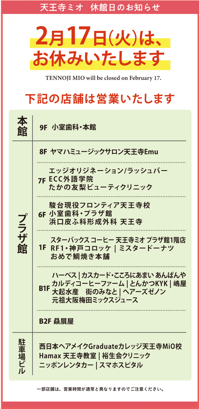 2/17(火)は休館日ですが、一部店舗は通常通り営業いたします。