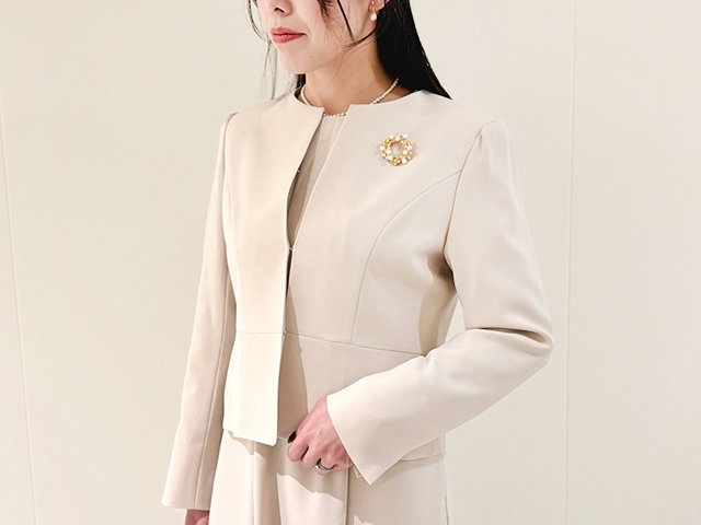 ワンピースとおそろいのジャケットを合わせた、クラシカルできちんと見えするコーデ。ベージュなら、やわらかく暖かみのある印象で大切なハレの日にぴったりです。