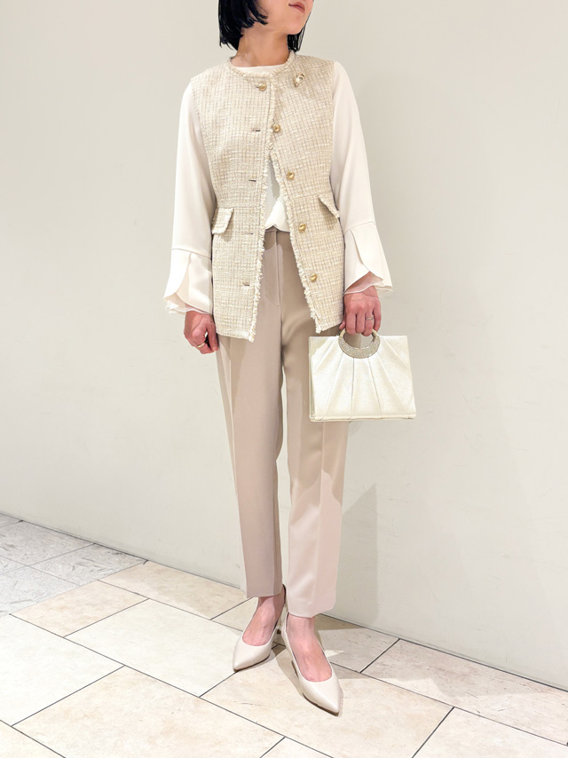 ニュアンスのあるシフォンブラウスに、ジレと同系色のパンツ&パンプスを合わせて、ワントーンの洒落感コーデに。ブローチをプラスして、よりハレの日らしく。