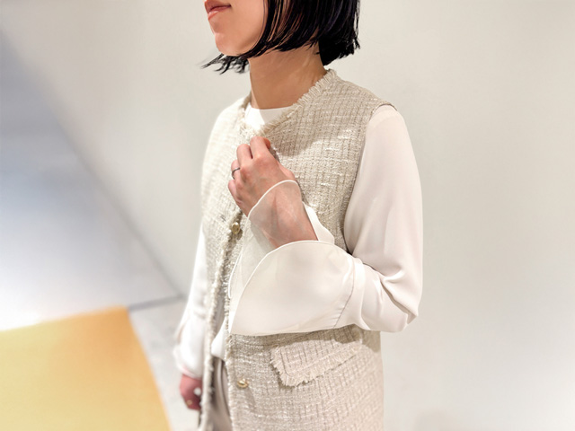 袖口のフレアが美しいブラウスは、ジレジャケットとの相性も抜群。腕を動かすたびにふわふわ揺れて、綺麗なニュアンスを残します。