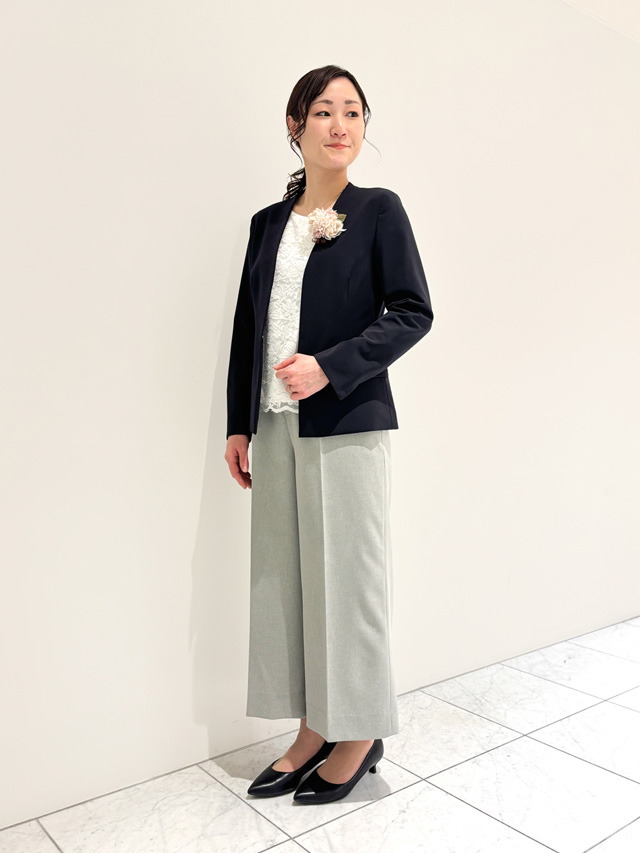 ジャケットとパンツのカラーを変えることで、ほどよいおしゃれ感を演出。コサージュをプラスすれば華やかさがぐんとアップします。