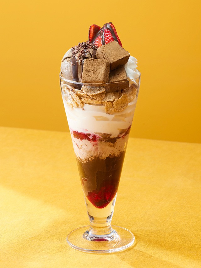 チョコとほうじ茶の香ばしさが調和したパフェ。ほうじ茶アイスやほうじ茶生チョコレートに、フレッシュな苺やチョコクランチがアクセント♪ソースには店内で点てたほうじ茶を使い、宇治「売茶中村」のほうじ茶パウダーを使用するなどこだわり派な1杯です。