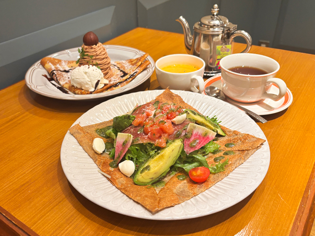 香ばしく焼いたガレットに生ハムとモッツァレラのサラダをのせ、バジルソースで味を引き締めた一皿が主役。お好みのクレープとドリンクも付いた充実のランチセットで、いつもとはちょっぴり違う特別な日のお食事にぴったりです。