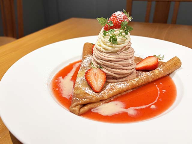 苺ムースとホワイトチョコムースが織りなす華やかな2層のモンブランに、苺の酸味が効いたスープ風クレープを添えたドリンク付きプレミアムセット。3月から4月末の季節限定なので、母の日を前にお母さまと一足早い特別なティータイムを満喫してみては♪
