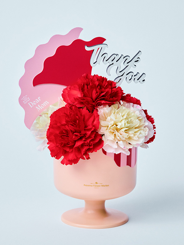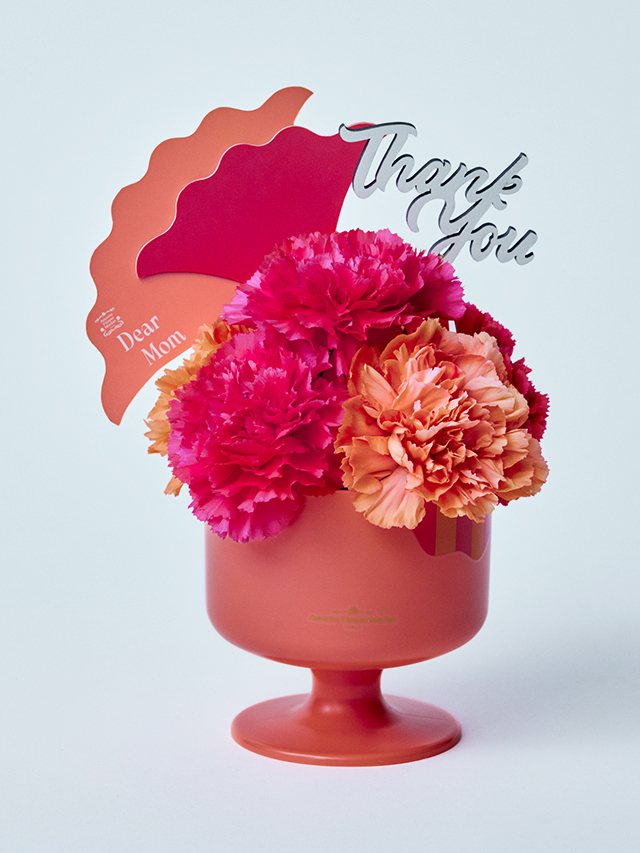 今年注目のリゾーティーな雰囲気を取り入れたデザートカップ型のアレンジメント。母の日の定番であるカーネーションに感謝の想いを込めて、お母さまに華やかなサプライズを♪