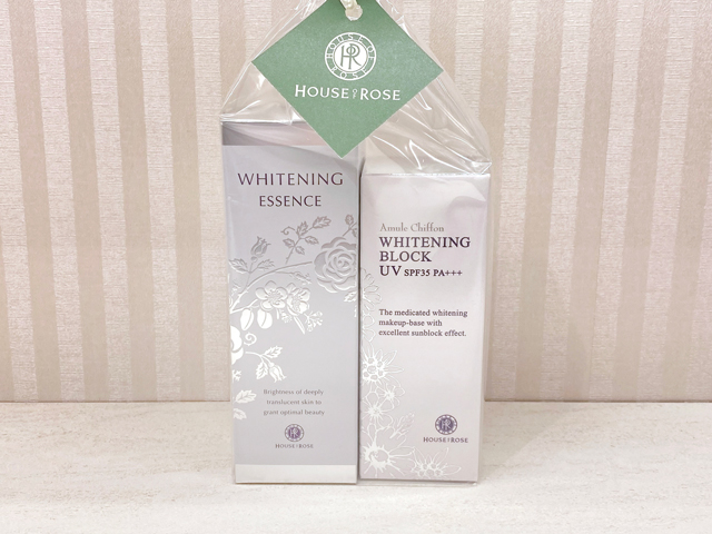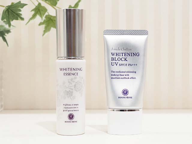 薬用美白※1美容液「ホワイトニング エッセンス」はみずみずしいテクスチャーで肌にすっとなじむ使い心地。日焼け止め下地「アミュールシフォン ホワイトニングブロックUV」はキメを整え、ファンデーションの仕上がりがワンランクアップします。