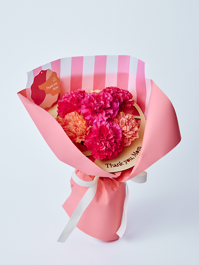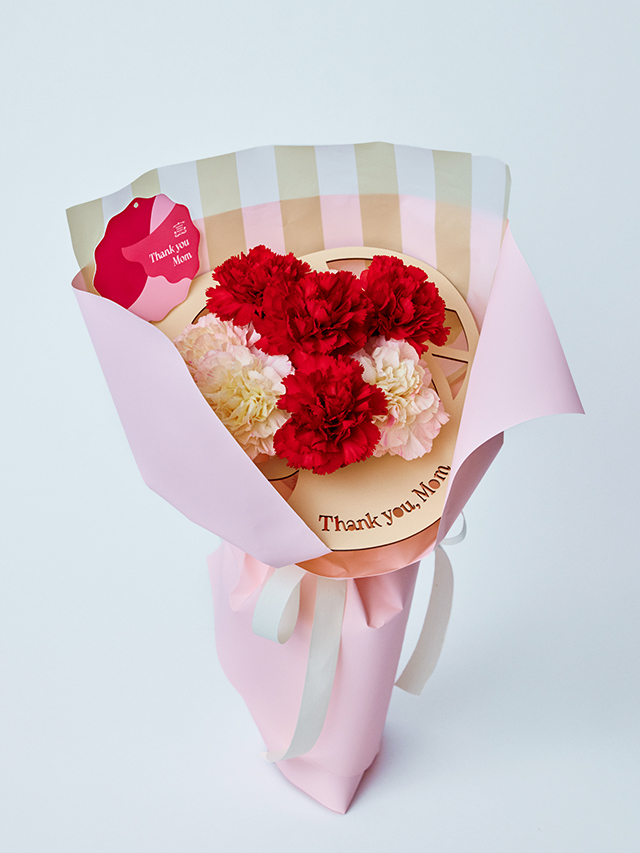 木製のメッセージカードとストライプ柄のペーパーがナチュラルな雰囲気を添えるブーケ。カーネーションはレッド・ピンクの2色から選べるので、お母さまの好みや雰囲気にあわせてチョイスしてみてください♪