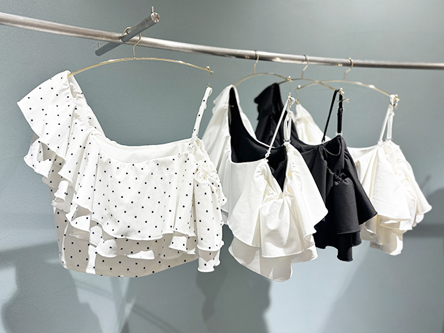 フリルとギャザーが印象的なトップスもスタッフさんイチオシのアイテム。フリルを肩から落とすとオフショルダーとしても着られます。レースアップのショーツと合わせてスタイルの良さをアピールするのもおすすめ。