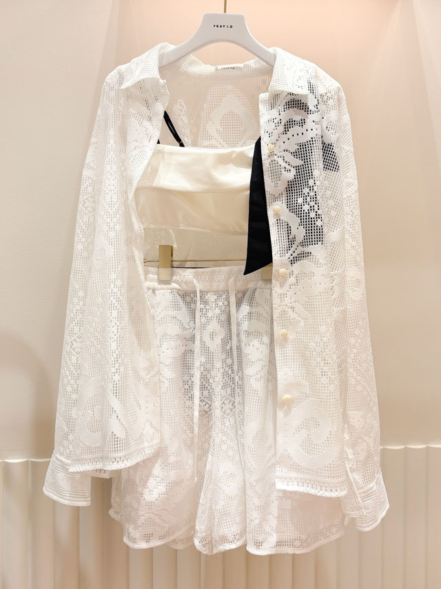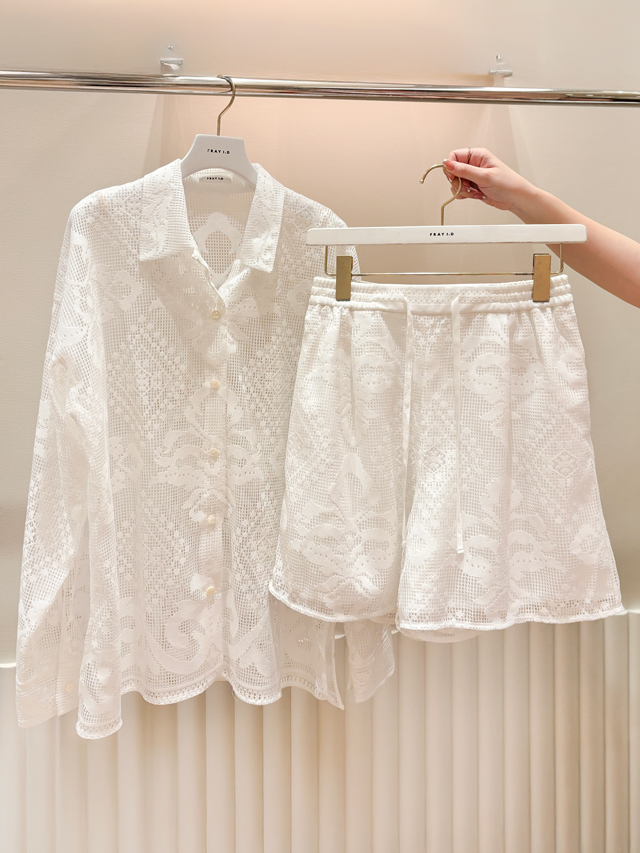 パネルレースのシャツ&ショートパンツのセットアップは水着の上からも着やすく、夏のリゾート気分を満喫できるおすすめのコーデ。