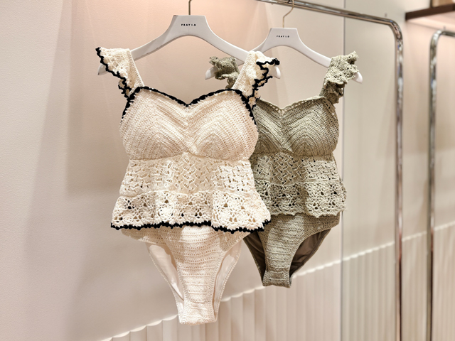 シルエットが可愛いクロシェ編みのスイムウェアもイチオシのアイテム。フロントはしっかりとした編み地で、取り外し可能なパッドも入っているので安心です。