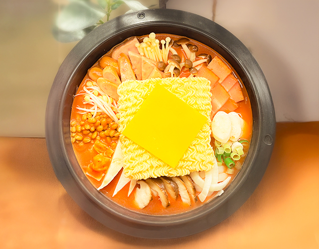 豚肉やソーセージ、ラーメンなどが入った具材たっぷりのチゲ鍋!