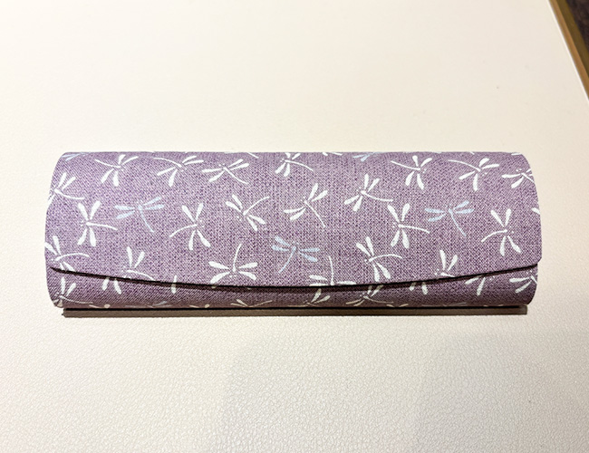 トンボのデザインが愛らしいシーチング和調のメガネケース。蓋がついているから繊細なメガネを保護してくれます。
