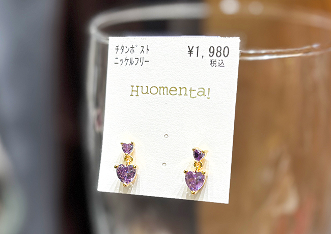 パープルカラーが印象的なピアス。キラキラと輝き、耳元を華やかに彩ります。シンプルなコーディネートにもアクセントを添え、大人の上品さと遊び心を両立したデザインです。