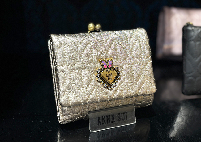 ハートのキルティングと繊細なブローチが印象的な、フェミニンでどこかクラシックなムードを纏った「ドリーミー」シリーズ。甘くなりすぎないハートモチーフに、バタフライを組み合わせたANNA SUIらしい世界観が、大人の可愛らしさと上品さを演出します。