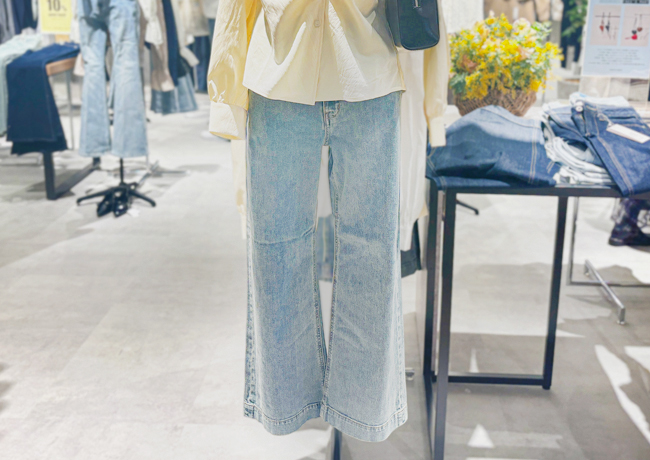ややハイウエストで、ほどよく広がるシルエットが魅力のベーシックなワイドデニムパンツ。脚長効果が期待でき、タックインスタイルもきれいに決まります。