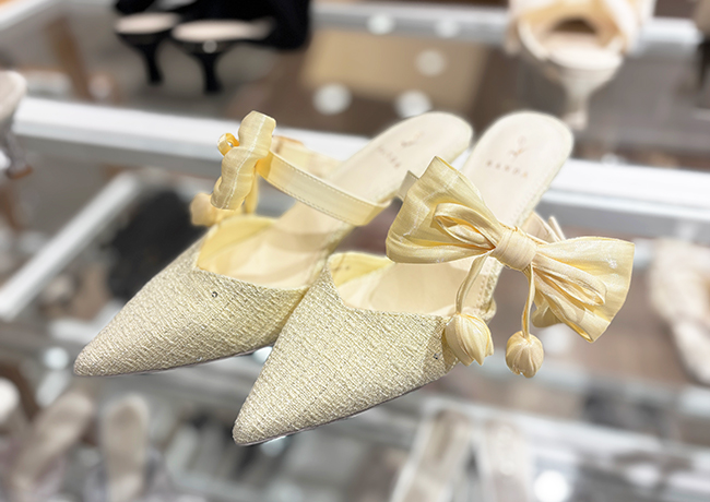 春らしいやわらかなイエローカラーに、華やかなリボンをあしらったミュールパンプス。足元に明るさをプラスし、コーディネートをぐっと華やかな印象に仕上げます。上品さと可愛らしさを兼ね備えた、季節感あふれる一足です。