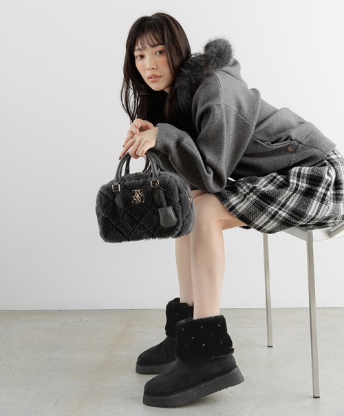 煌めくビジューとキルティングデザインのファーが印象的なムートンブーツ。
