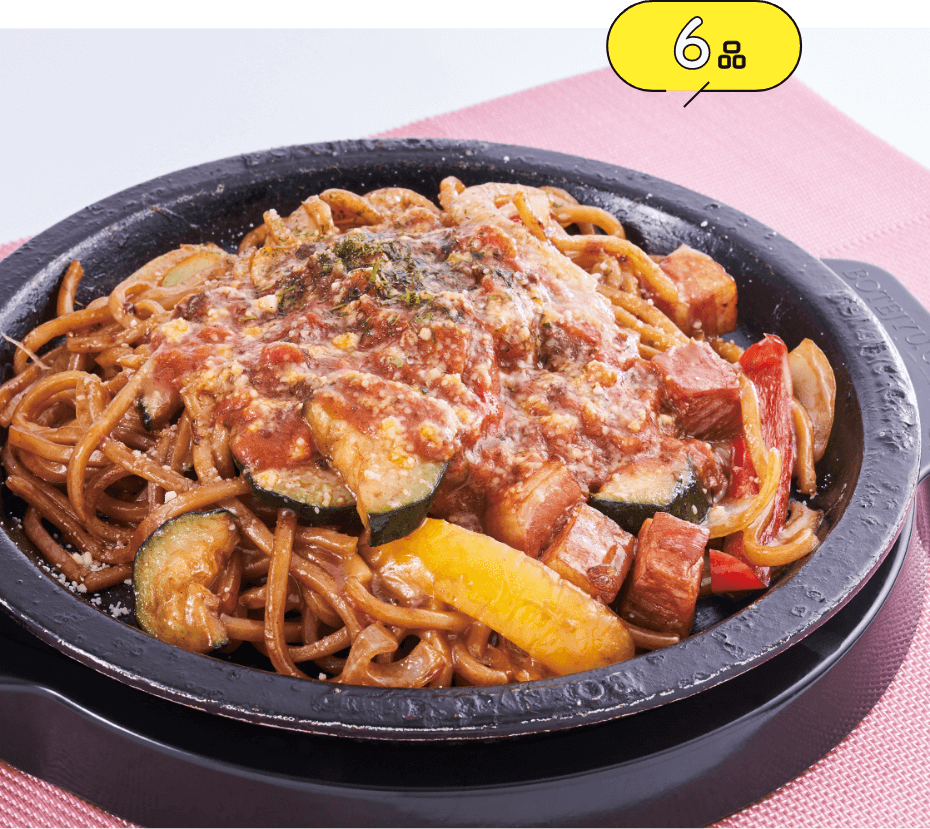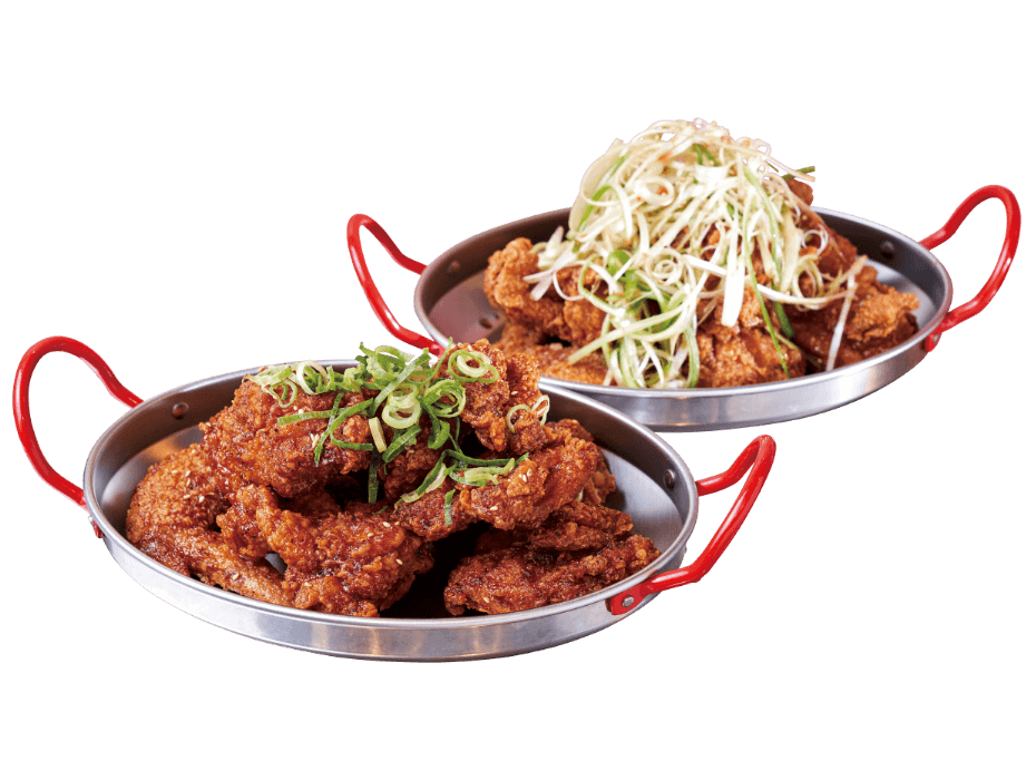 韓国フライドチキン通常4種類のところ、特別に2種類追加の6種類を期間限定でご用意。バーベキュー味のオリジナルカルビフライドチキンと、たっぷりのネギが盛られた甘辛醤油味のカンジャンパダッチキンをご賞味あれ。