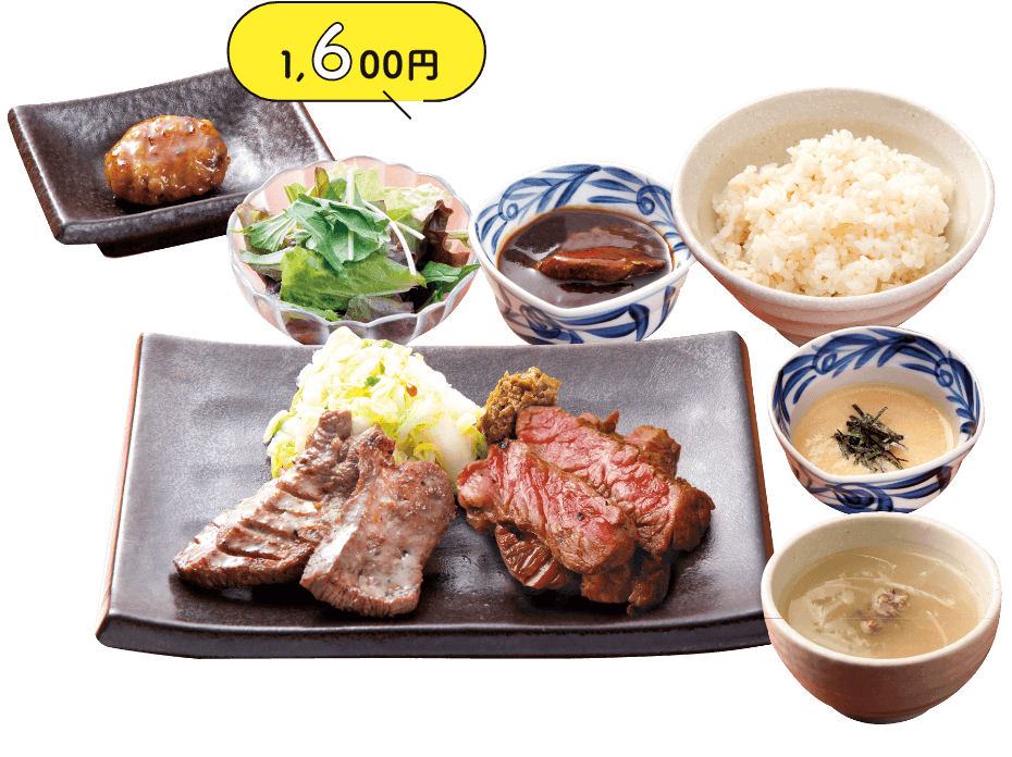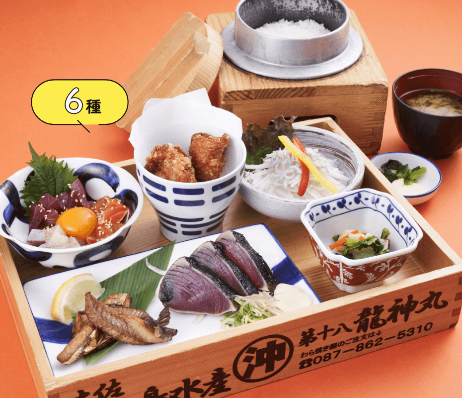 かつおのタタキ、高知以外ではレアなハランボのわら焼き、唐揚げ、海鮮ユッケ、サラダ、小鉢の6種類のおかずと炊き立てご飯、味噌汁、漬物が付いたボリューム満点の定食セット。