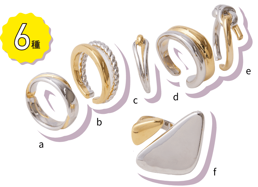 こなれ感のあるゴールド×シルバーのミックスカラーリングを6種類販売。手元に華やかさと存在感を。