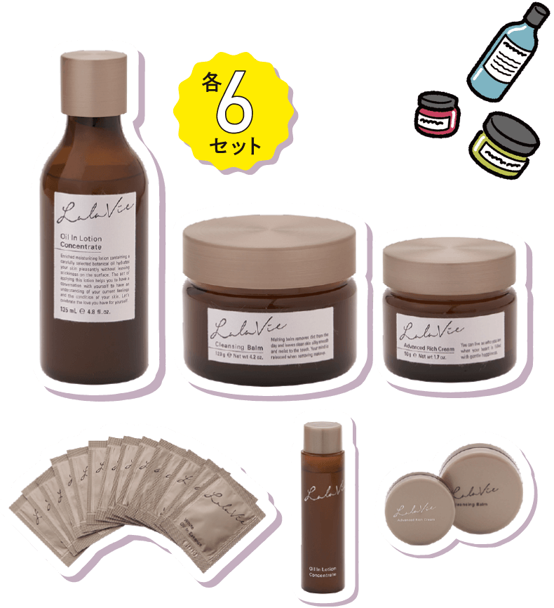 クレンジング、ローション、クリーム、サンプル数点が付いた徹底保湿エイジングケアセットを6セットご用意。その他、ホワイトニングケアセット、ハンド&ボディケアセットも各6セット販売!