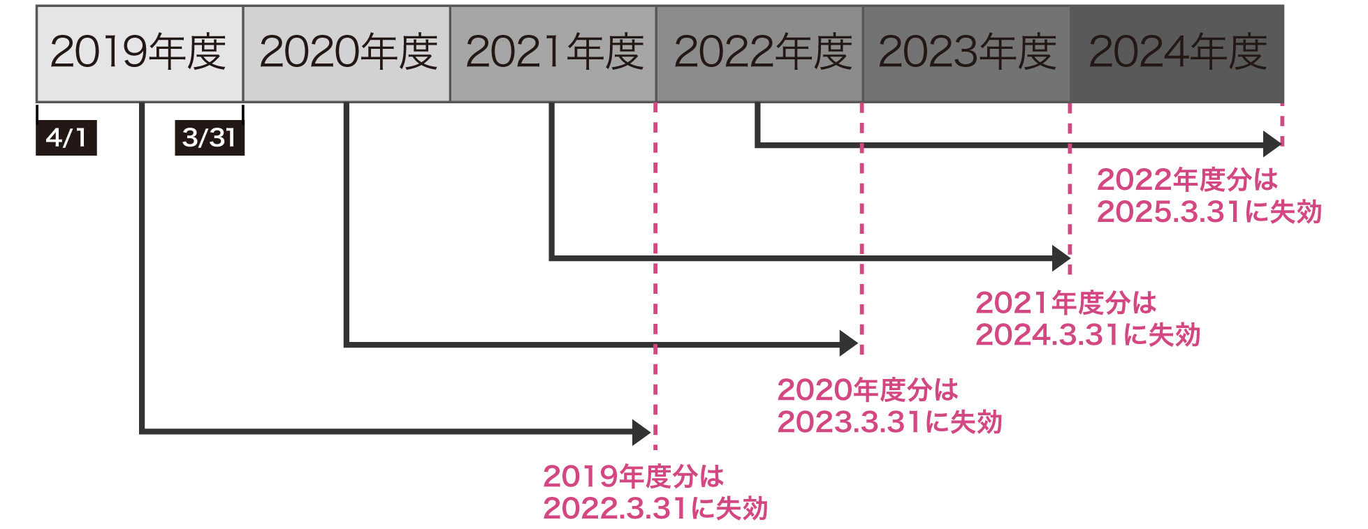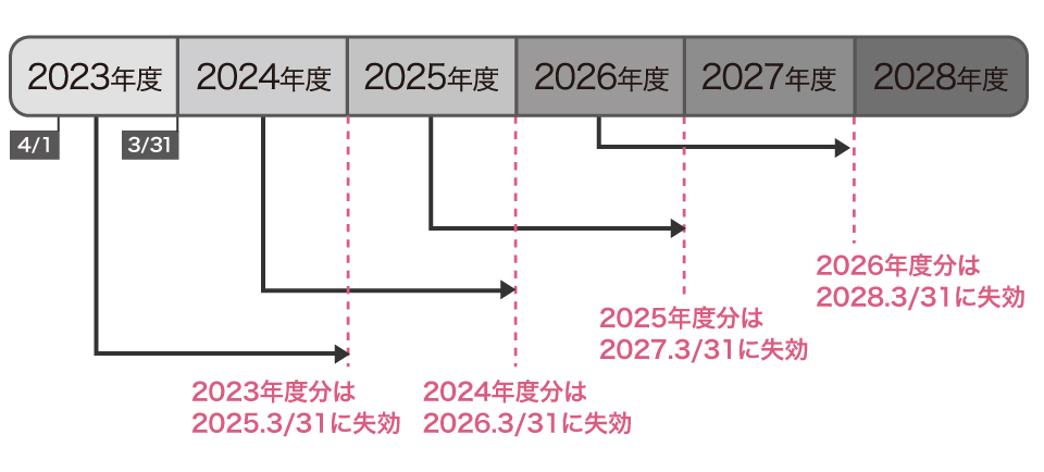 毎年4月1日から翌年3月31日までに加算されたポイントは、ポイントを取得した年度の翌年度末日(3月31日)をもって失効します。