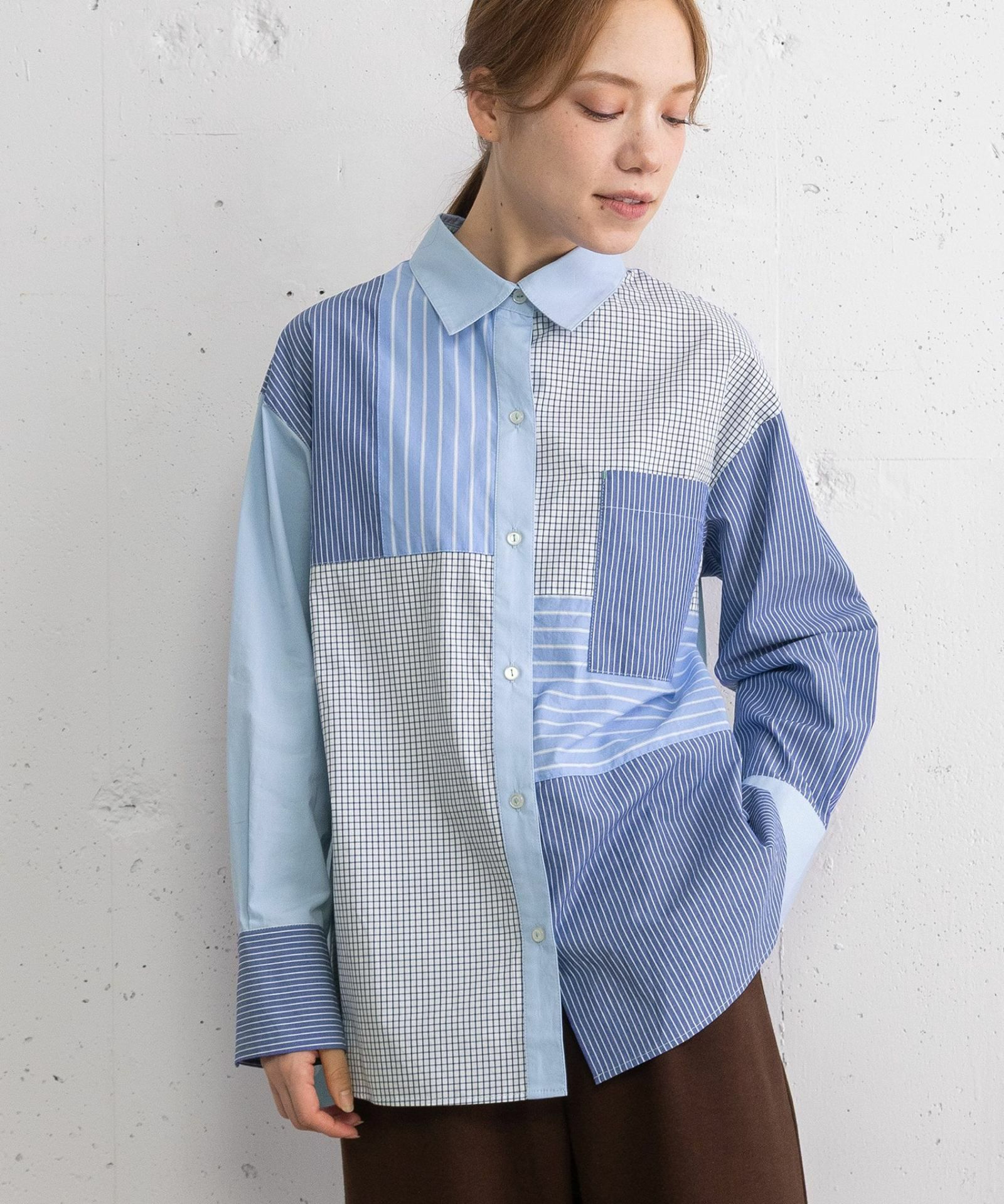 無地ベースで異素材ミックスの遊び心を取り入れたプードゥドゥらしいデザインのシャツをレイヤードしてみました!