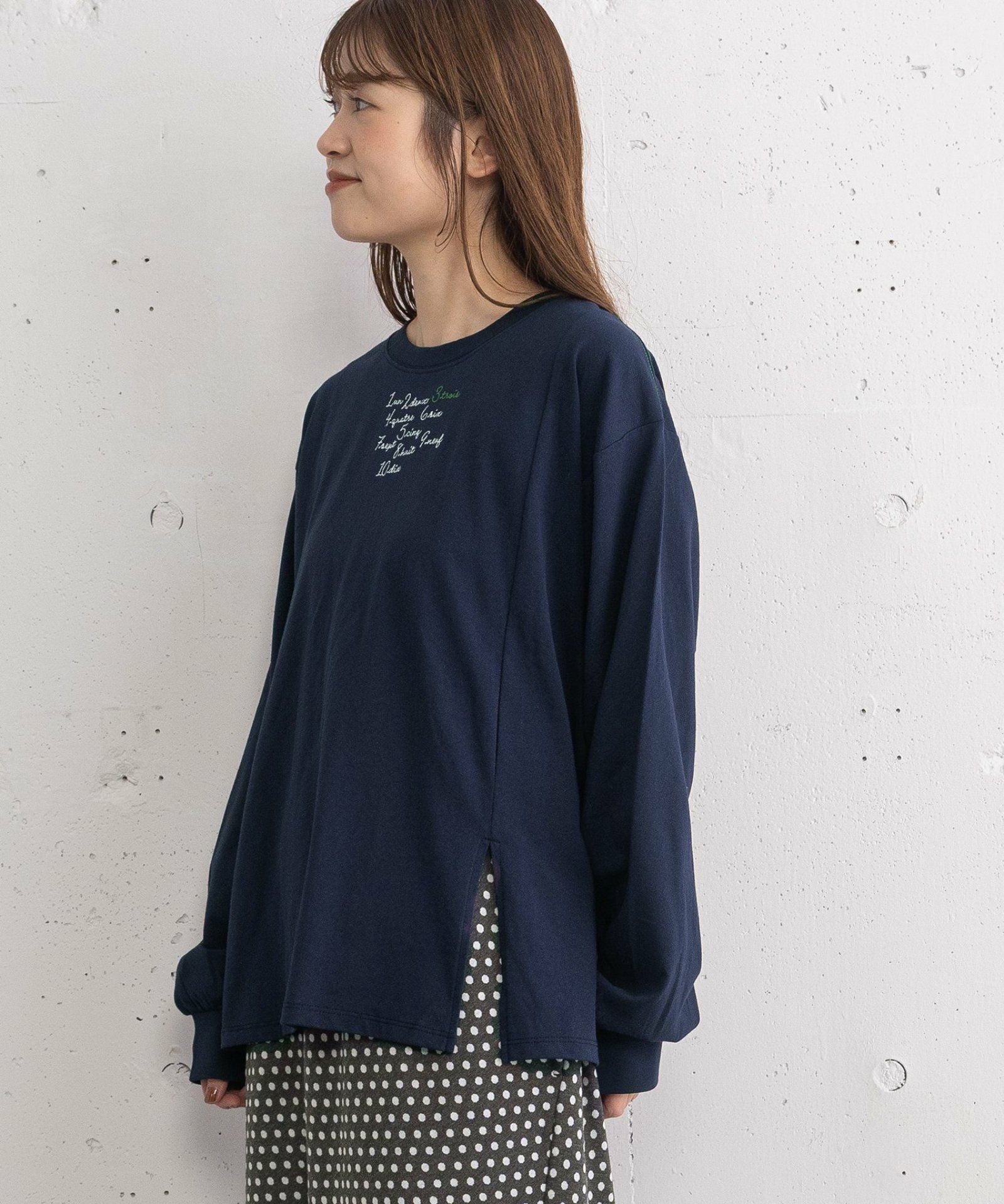 フロントの手描きタッチ刺繍がポイントのロンT。
