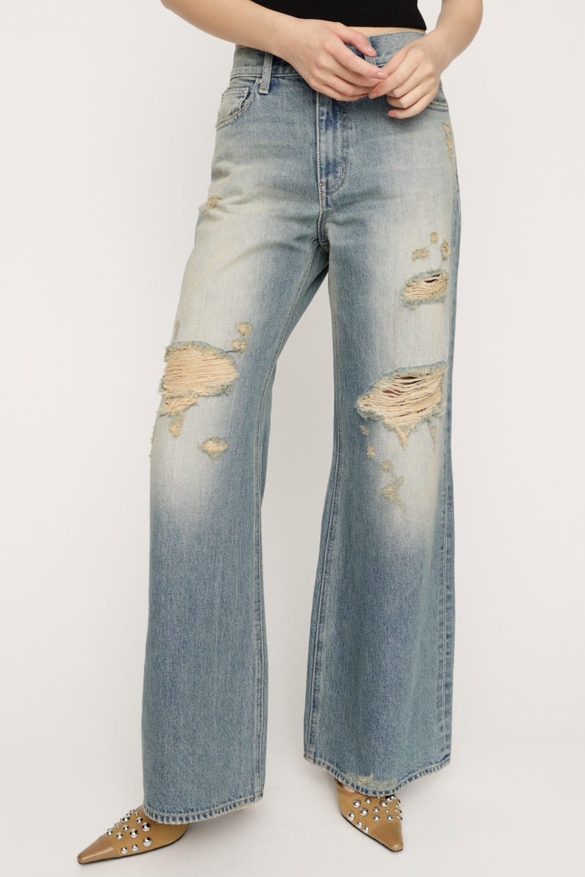 デニムは164cmで、サイズ1を着用しております! おへそくらいの位置までのハイウエストなデニムですが、柔らかい生地感なので座ったりしても嫌な窮屈感はありません。 ダメージ部分も膝上だったり、破れにくい位置に計算して施されているので、 すぐビリビリになることもなく着用していただけます!
