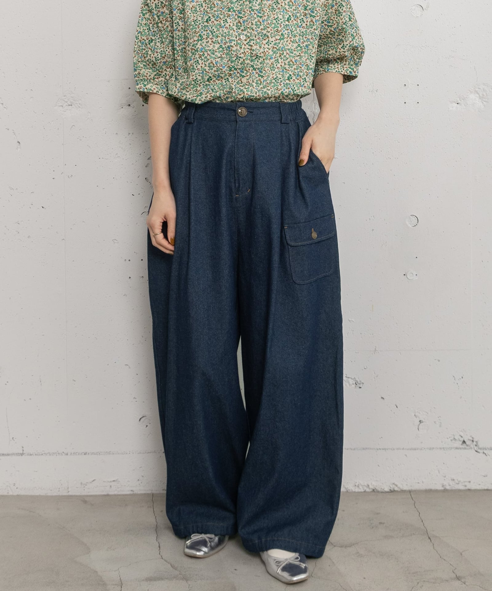 裾の紐を縛ってシルエットの変化を楽しんでいただけます。今回は絞らず履いております。