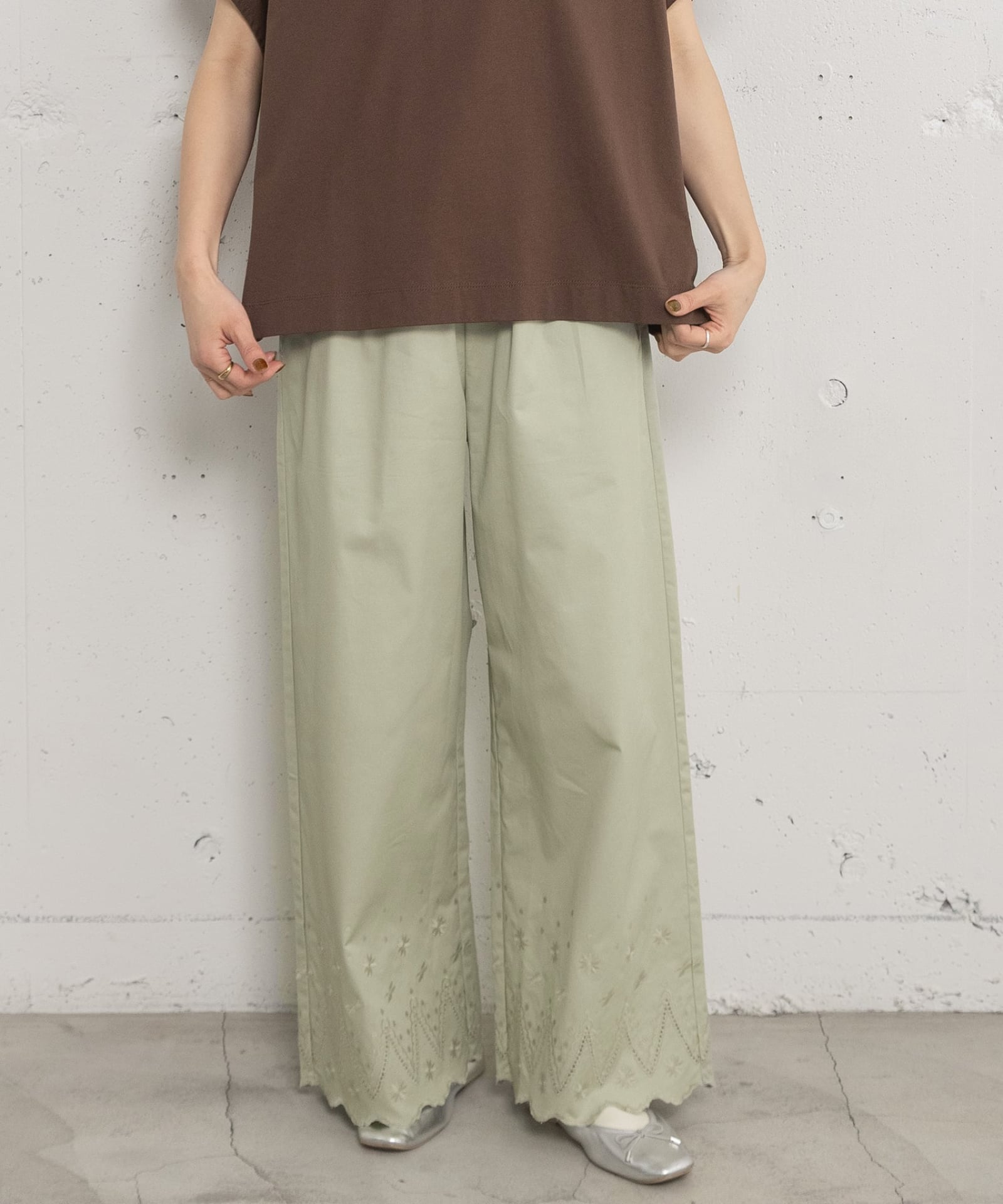 ウエストは安定のぐるりゴムの仕様で楽な履き心地。紐でサイズ感の美調整も可能です。