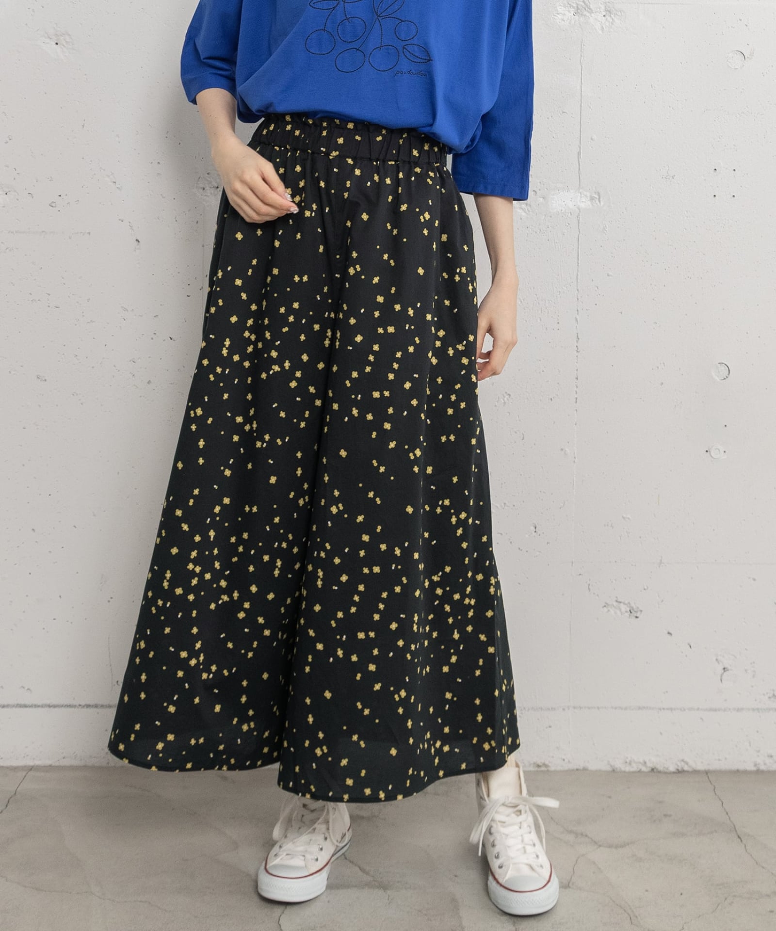 花柄とドットを散りばめたオリジナルプリントのキュロットです。