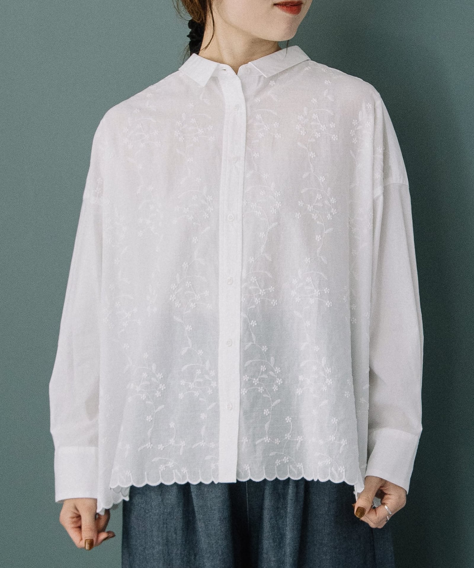 身頃部分は前後共にお花の刺繍が贅沢に入ったブラウスです。