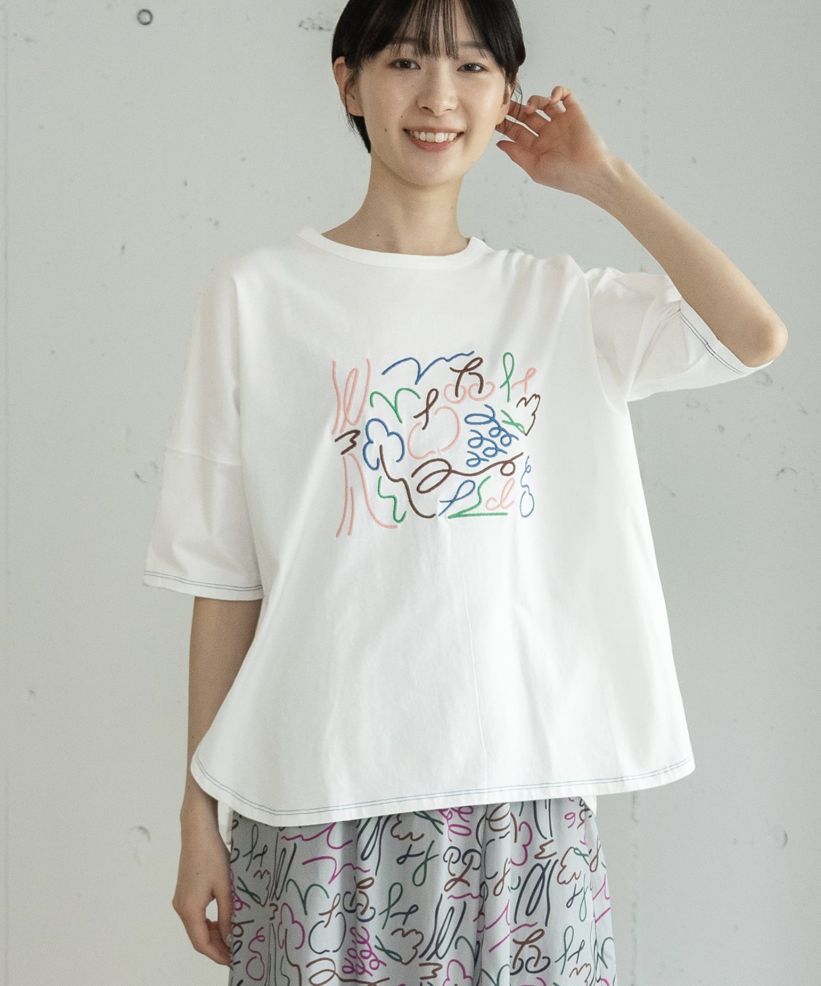くるくるとした躍動感のあるフルーツイラストを手描きタッチのミシン刺繍でデザインされてます。