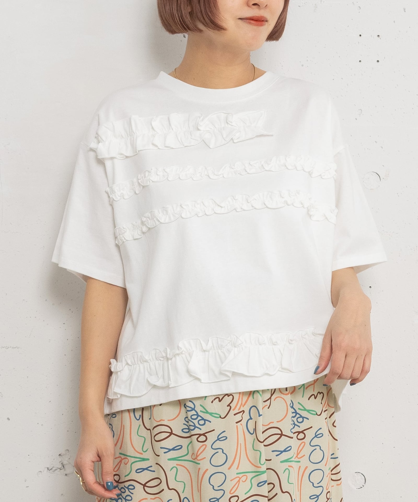 ランダムにフリルを縫い付けたデザイン性のあるTシャツです。