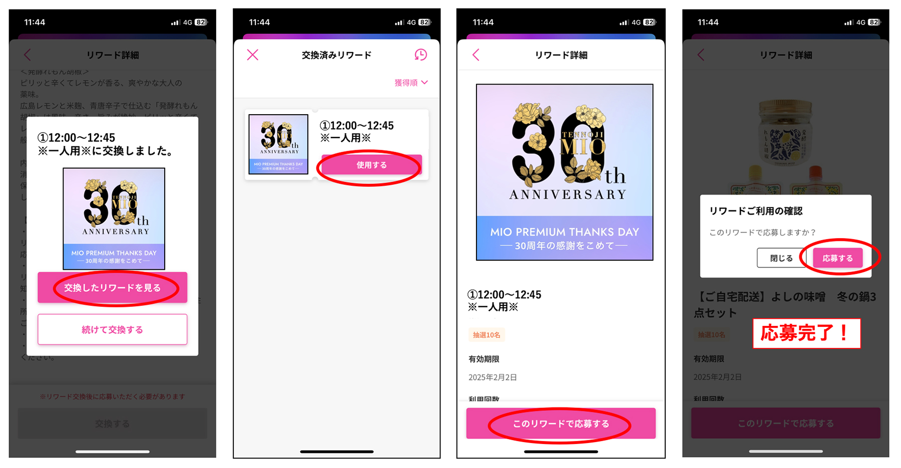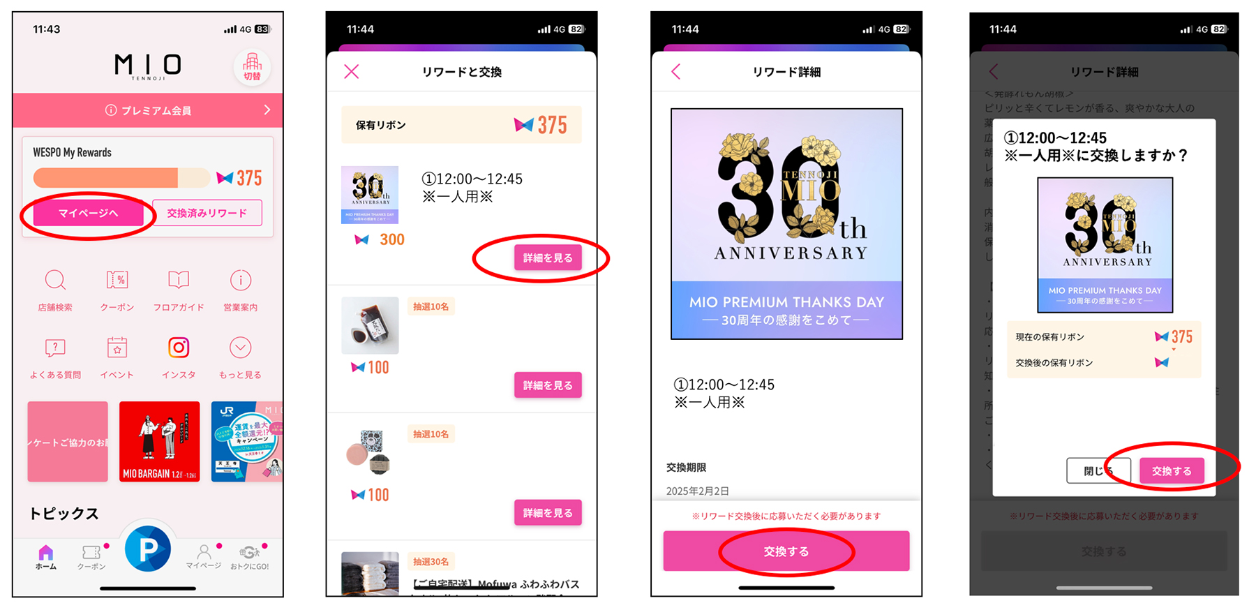 WESPOアプリの「マイページ」から「リワードと交換する」をクリックし、参加希望の時間と人数を選択いただき、ご応募ください。応募には300リボンが必要となります。