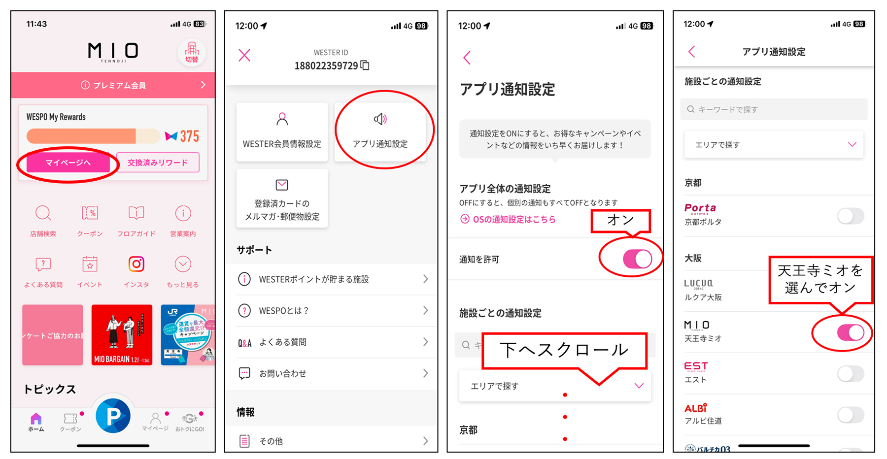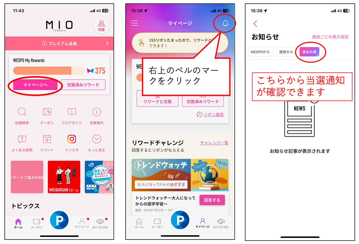 WESPOアプリのお知らせにて当選通知を配信いたします。PUSH通知をONにしてお待ちください。