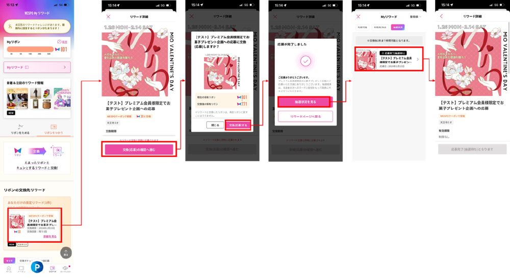 WESPOアプリの「マイページ」から「リワードと交換する」をクリックし、ご応募ください。応募には30リボンが必要となります。
