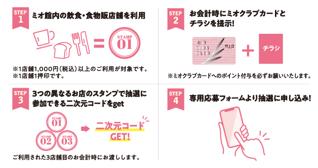 期間中に異なる3店舗をまわり、1店舗で1,000円(税込)以上お支払いいただくと、ミオポイントが当たる抽選にご応募いただけます。