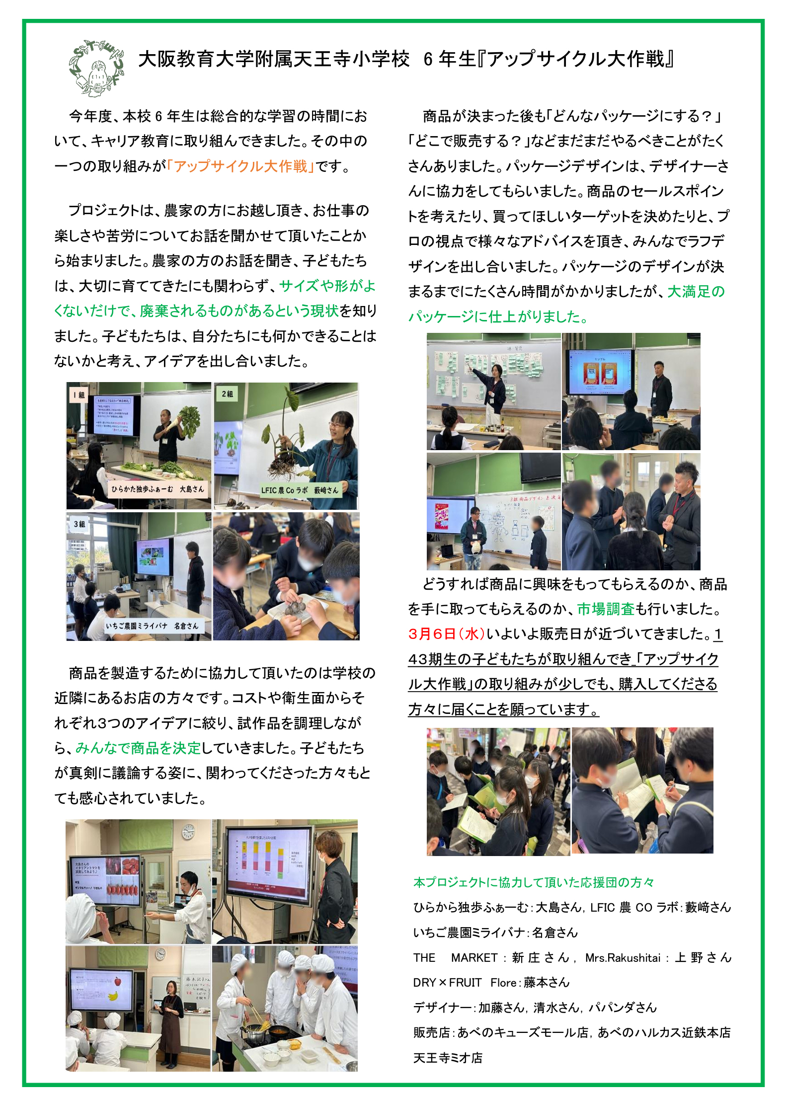 大阪教育大学附属天王寺小学校のキャリア教育の一環として行われる、廃棄ロス削減を目的とした商品開発の取り組みです。