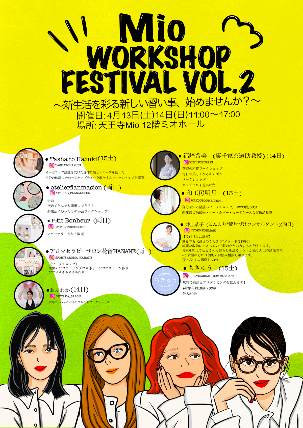 新しいことを始めたくなる季節。ワクワクする季節に取り入れて欲しいコンテンツが盛だくさんのイベントです。女子力アップ!のワークショップ、親子で楽しめるワークショップ。様々なジャンルのスペシャリストが集結。ぜひ体験し、新生活に取り入れてください。