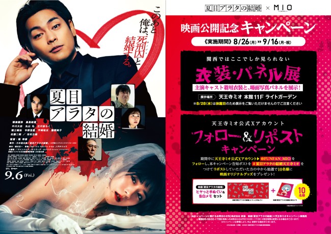 キャンペーン期間中、天王寺ミオ公式Xアカウント《天王寺ミオ@2024年 @FUNFAN_MIO》をフォローし、本キャンペーン告知ポストを《#夏目アラタの結婚天王寺ミオ》をつけてリポストしていただいた方の中から抽選で10名様に《映画『夏目アラタの結婚』ヒヤっと手ぬぐい&告白メモセット》をプレゼント!