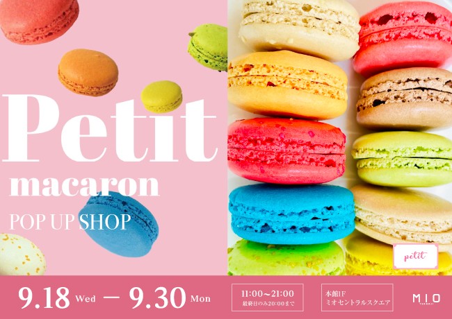 【期間】 9月18日(水)〜9月30日(月) 【時間】11:00〜21:00 ※最終日のみ20:00まで 【場所】本館1F ミオセントラルスクエア マカロンは「特別な人」というお菓子言葉を持ちます。 特別な人への贈り物・お土産にいかがでしょうか。 外はさっくり,中はしっとりのやさしい味わいのマカロンです。 是非一度ご賞味ください。