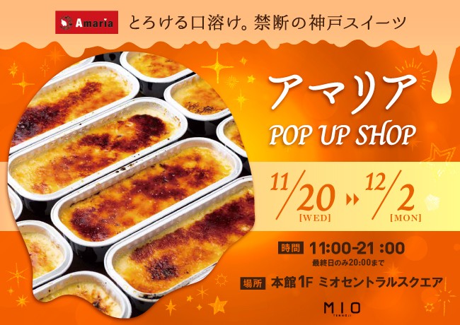 【期間】11月20日 (水)〜12月2日(月) 【時間】11:00〜21:00※最終日は20:00まで 【場所】本館1F ミオセントラルスクエア 期間限定で禁断の神戸スイーツ特別販売! みなさまに愛されるスイーツを目指し、ひとつひとつ丁寧にこだわりを持って作っています。 一人でも多くのお客様にお会いできることを楽しみに、笑顔でお待ちしております!