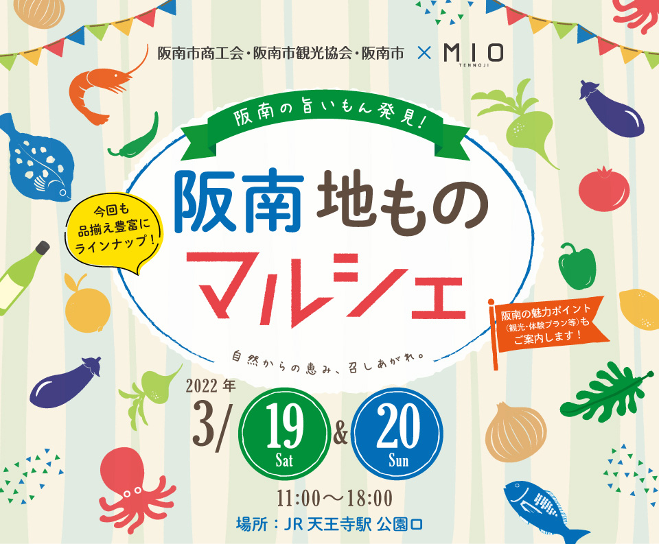 里海・里山の自然環境に恵まれた環境だからこそ、今でも漁業や農業が盛んに行われており、地元の名産物がたくさんあります。今回は阪南の名物店舗を集め、天王寺に出張出店。生産者たちの愛情がこもった阪南の地ものをご用意し、皆様のお越しをお待ちしております。