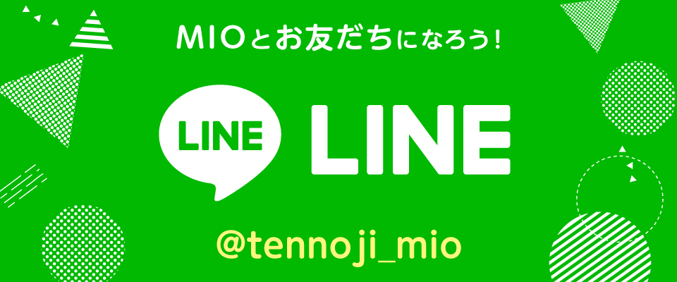 「LINE」アプリ内の「友だち追加」から「ID検索」を選択。「ID」にチェックが入っていることを確認いただき「@tennoji_mio」と入力し、「追加」をタップしてください。
