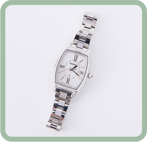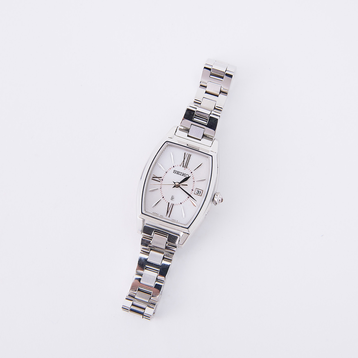 放射状の型打ち模様を施した花びらのようなダイヤルが目を引く、電池交換不要のソーラー電波モデル。