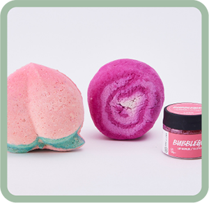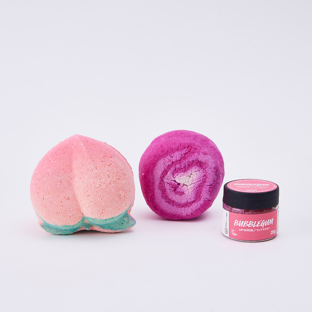 甘い香りにときめくバスボムとバブルバー、乾燥しやすい口元のケアに使えるリップスクラブのセット。