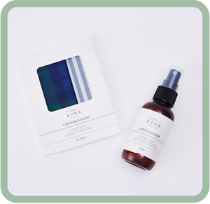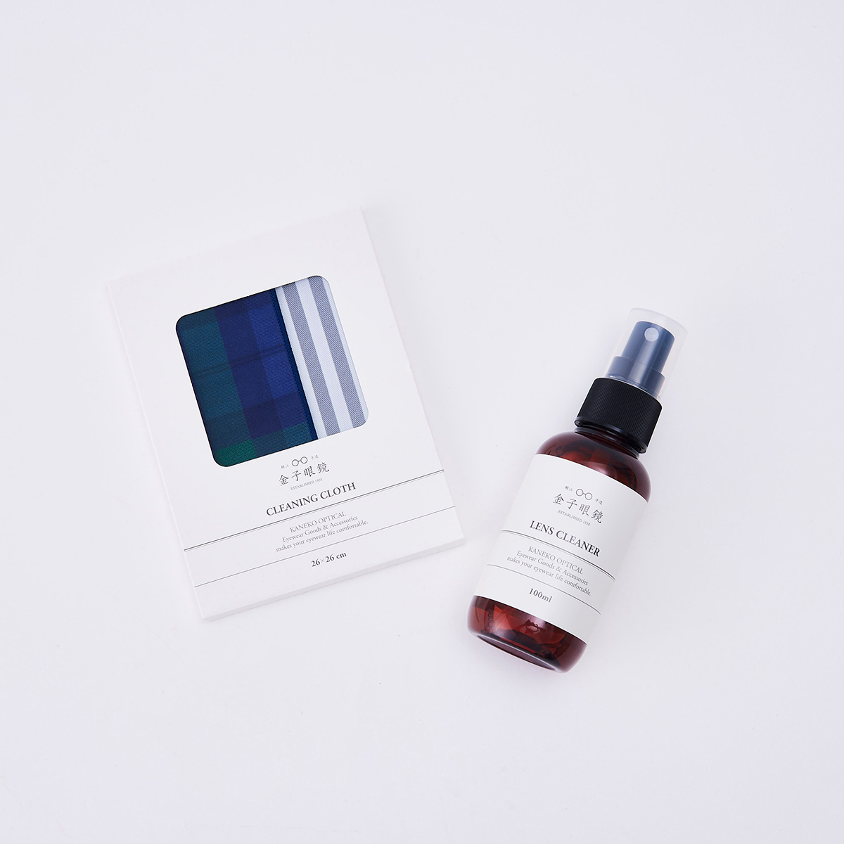 サッと拭くだけで汚れが落ちる高機能眼鏡拭きとレンズを清潔に保つクリーナーによるホームケアセット。