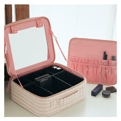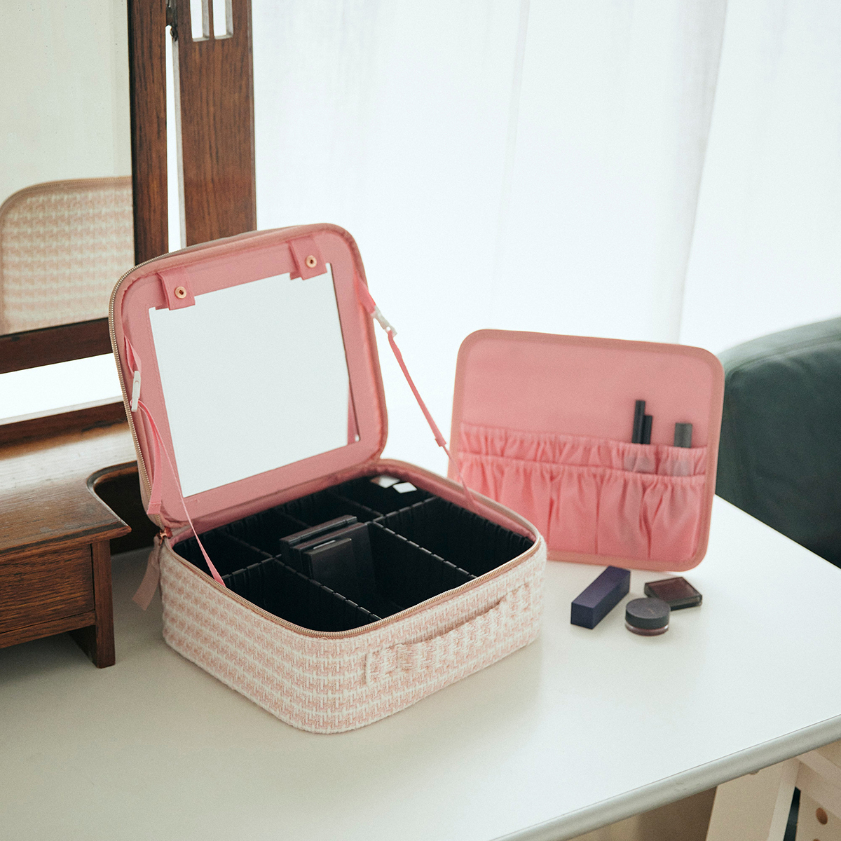 コスメを整理しやすいミラー付きのバニティバッグは、ドレッサーとしても使えて便利。フェミニンな雰囲気のピンクツイードがお部屋のアクセントに。
